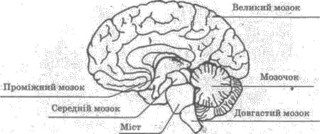 Міститься головний мозок у порожнині черепа і має такі відділи: довгастий мозок, міст, середній, проміжний мозок, які складають стовбур головного мозку; мозочок і великі півкулі. Сіра речовина, утворена тілами нейронів, вкриває півкулі мозку і мозочку, утворюючи кору. Крім того, вона у вигляді окремих скупчень (ядер) міститься в середині білої речовини. Біла речовина - утворює провідні шляхи, які зв’язують головний мозок зі спинним, а також частини головного мозку між собою.