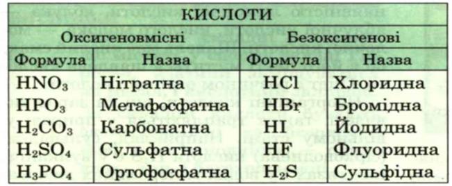 Рис.1.2 Приклад будови атомів Якщо уважно розглянути будову періодичної таблиці, можна побачити, що основна кількість металічних елементів розташовується у І, ІІ та ІІІ, рідше ІV групі, це означає те, що метали мають 1, 2 або 3 валентні електрони. Неметалічні елементи мають від 3 до 7 електронів зовнішнього енергетичного рівня. Тому під час утворення сполук (виникнення хімічного зв’язку між атомами) метали, як правило будуть віддавати свої валентні електрони, а неметали, забиратимуть їх. Віддаючи або приймаючи електрон, атом втрачає свою нейтральність, перетворюється на «+» або «-» заряджену частинку: катіон або аніон. Періодичний закон встановлює взаємозалежність між будовою атомів та їхніми хімічними властивостями. Періодичний закон Д.І. Менделєєва: властивості елементів, а відповідно і властивості утворених ними простих і складних* речовин перебувають у періодичній залежності від величини заряду ядра їх атома. Прості речовини – це такі речовини, які складаються з атомів одного і того самого хімічного елементу (Н2,О2,Сl2). Складні речовини – це такі речовини, які складаються з атомів різних хімічних елементів (H2O, H2SO4, NaCl, C2H5OH). 1.2 Основні класи неорганічних сполук Усі неорганічні сполуки, які існують в природі, поділяють на чотири класи: кислоти, основи, оксиди, солі. Вони відрізняються між собою за властивостями та складом. Табл.1.1 Основні клас неорганічних сполук