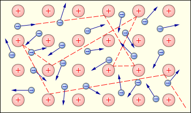 Рис. 2.2 Схематичне зображення хаотичного руху вільних електронів («електронного газу») між вузлами кристалічної решітки Однак різні метали все-таки мають різні фізичні властивості, такі, як температура плавлення, густина тощо. Ці властивості багато в чому залежать від кристалічних структур металів. Завдяки металічному зв’язку окремі шари в кристалах металів можуть зміщуватися відносно один одного. Це надає металам пластичності (ковкості) — здатності змінювати свою форму без розриву хімічних зв’язків.