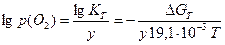 У виразі константи рівноваги гетерогенних реакцій, як і в кінетичних рівняннях таких реакцій, вказують концентрації лише газуватих або розчинених речовин. Прикладом гетерогенних реакцій є реакції термічної дисоціації оксидів (наприклад, метал оксидів) на прості речовини, тобто реакції розкладу оксидів на прості речовини за нагрівання: 2MexOy (т) Через те, що ці оборотні реакції відбуваються на поверхні поділу між твердою та газуватою фазами, константа їх рівноваги визначається лише тиском кисню: KT=py(O2), (6.17) або у логарифмічному вигляді: lgKT = ylgp(O2), (6.18) Рівноважний тиск кисню, який утворюється в замкненій системі внаслідок термічної дисоціації оксиду металу називається тиск дисоціації оксиду. З виразу (6.18) тиск дисоціації оксиду дорівнює: