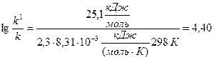 Підставляємо у цей вираз величину зниження енергії активації реакції у присутності каталізатора, значення універсальної газової сталої (R=8,31∙10-3 кДж/(моль∙К)) та температури: