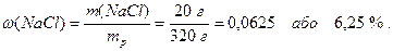 Моляльність вимірюється у моль/(кг розчинника). Приклад 1. У воді об`ємом 300 мл розчинили натрій хлорид масою 20 г. Густина води дорівнює 1000 г/л. Розрахуйте масову частку NaCl у розчині. Розв'язання. Визначимо масу розчинника (води): m(H2O) = V(H2O) · d(H2O) = 0,3 л · 1000 г/л =300 г Маса розчину дорівнює: mр = m(NaCl) + m(H2O) = 20 г + 300 г =320 г Розрахуємо масову частку NaCl у розчині (7.1):