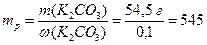 Приклад 2. Розрахуйте об`єм водного розчину з масовою часткою калій карбонату 10%, в якому міститься K2CO3 масою 54,5 г. Густина розчину становить 1090 г/л. Розв'язання. Обчислюємо масу розчину (7.1):