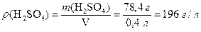 Приклад 3. Водний розчин об`ємом 400 мл містить кількість сульфатної кислоти 0,8 моль. Обчисліть масову концентрацію H2SO4 у розчині. Розв'язання. Розрахуємо масу сульфатної кислоти (1.7): m(H2SO4) = n(H2SO4) · M(H2SO4) = 0,8 моль · 98 г/моль = 78,4 г. Обчислимо масову концентрацію H2SO4 у розчині (7.3):
