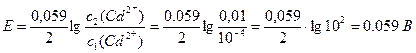 Приклад 5. Концентраційний гальванічний елемент (ГЕ) складається з двох кадмієвих пластин, занурених у розчини солі з концентрацією йонів Сd2+ 10–4 моль/л та 0,01 моль/л. Складіть схему ГЕ, напишіть рівняння електродних процесів та розрахуйте електрорушійну силу ГЕ. Розв’язання. Оскільки φ анода < φ катода, то за рівнянням Нернста (10.6) анодом є електрод, занурений у розчин солі з меншою концентрацією йонів Сd2+, яка за умовою становить 10–4 моль/л. Катодом є електрод, який знаходиться у розчині з концентрацією йонів Сd2+ 0,01 моль/л. Схема концентраційного ГЕ має такий вигляд: (Анод “–”) Сd | Сd2+, c1(Сd2+) || Сd2+, c2(Сd2+) | Сd (Катод “+”) c1(Сd2+) = 10–4 моль/л c2(Сd2+)= 0,01 моль/л На аноді відбувається окиснення атомів кадмію, а на поверхні катода – відновлення йонів кадмію. Рівняння анодного процесу: Сd – 2e- = Сd2+ | 1 Рівняння катодного процесу: Сd2+ + 2e- = Сd | 1 За виразом (10.11) розрахуємо електрорушійну силу концентраційного ГЕ: