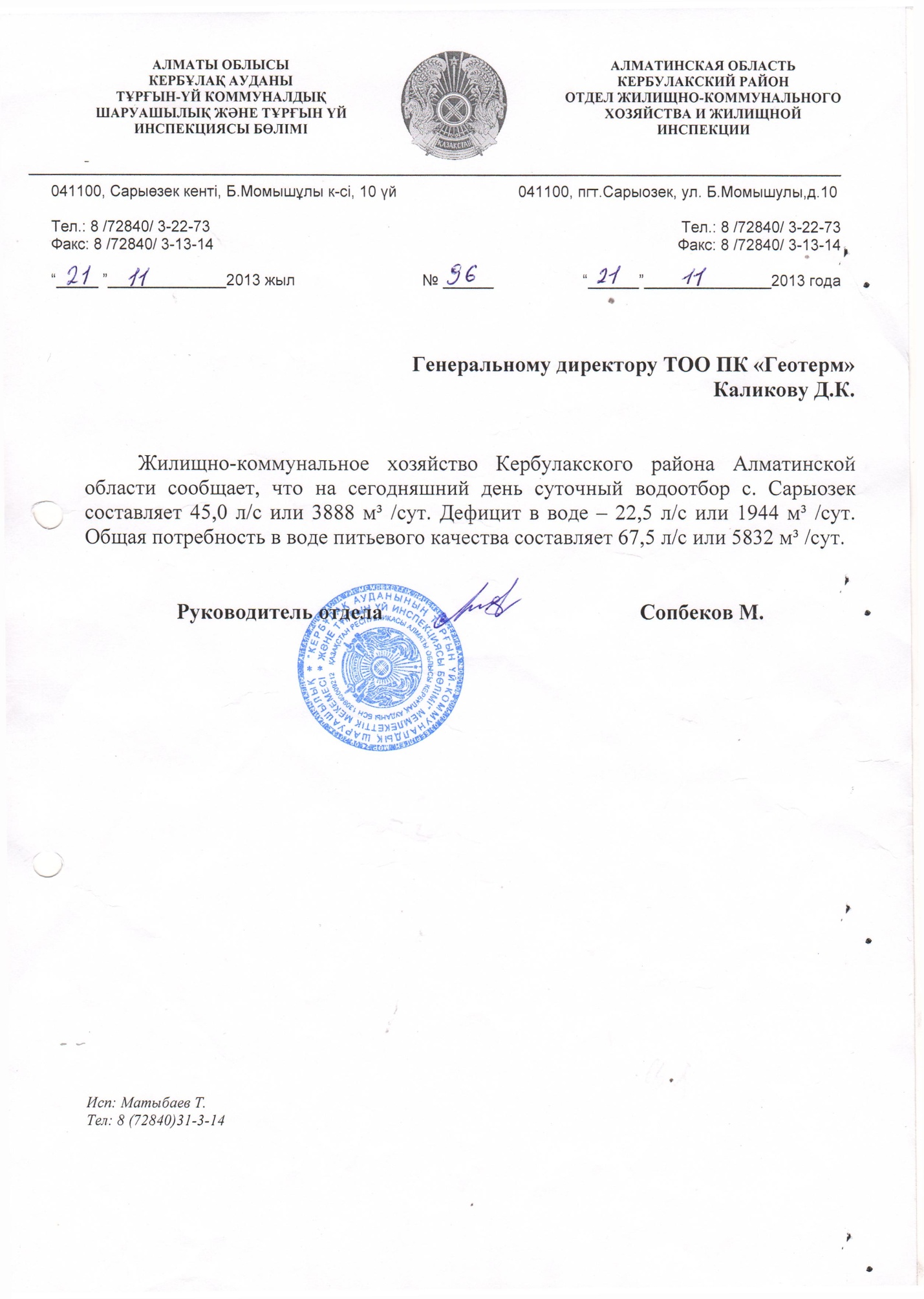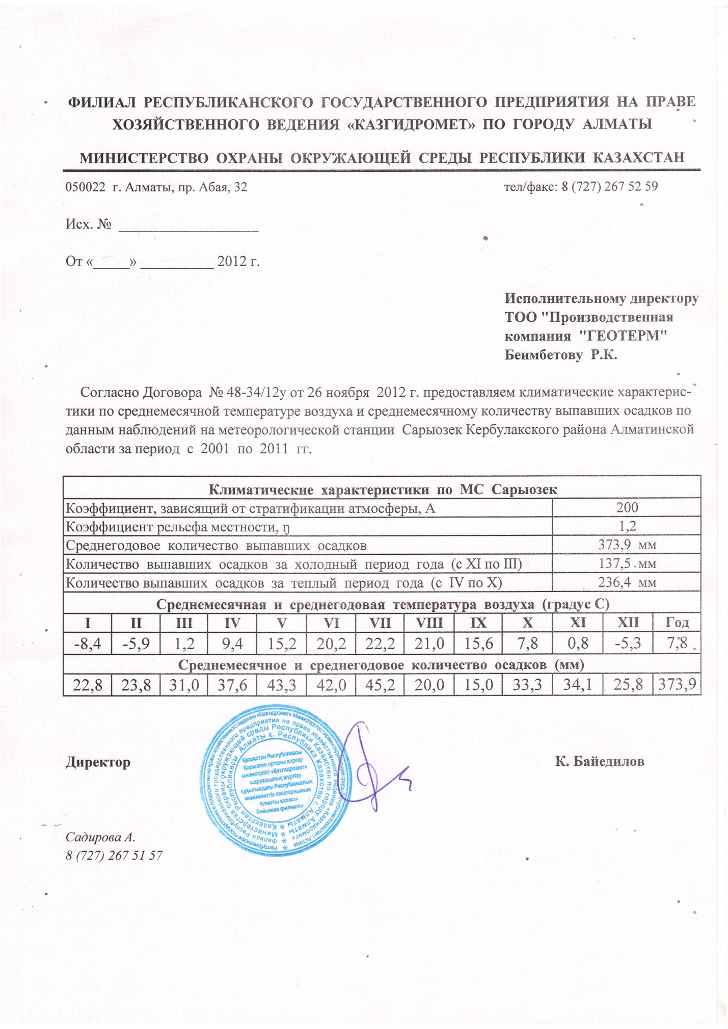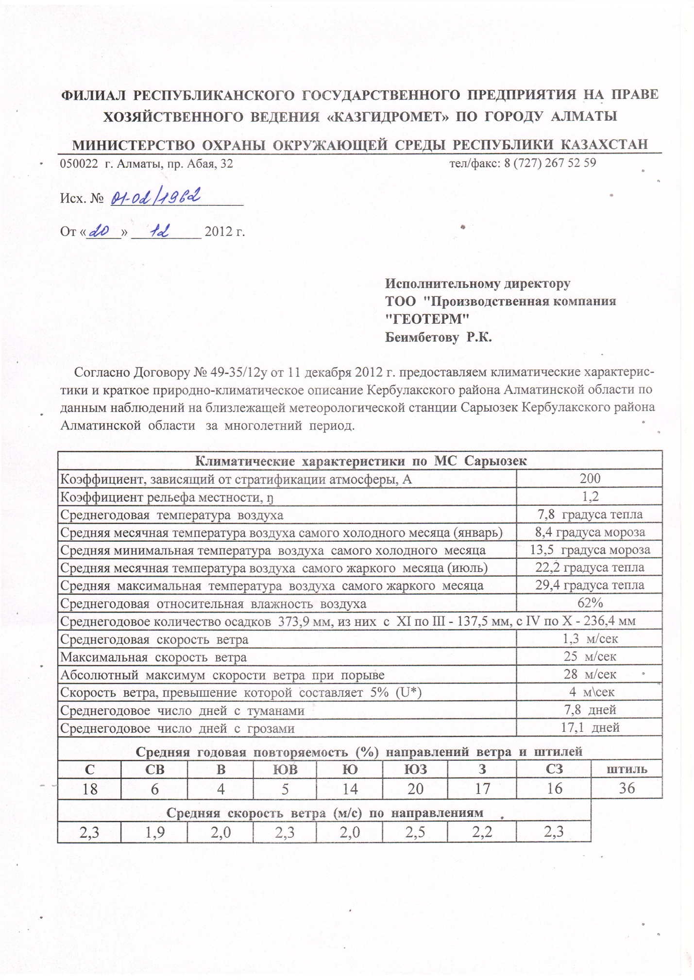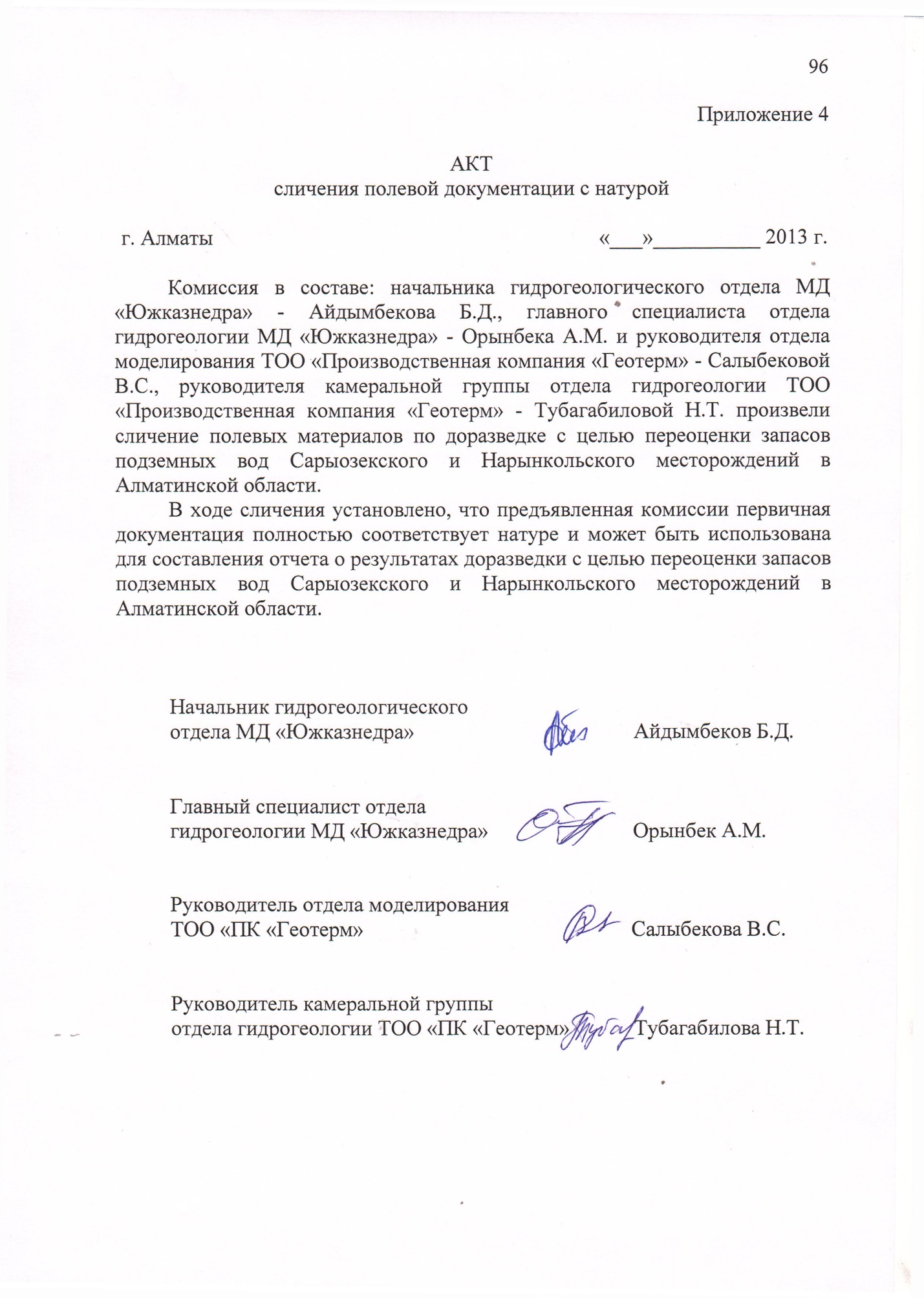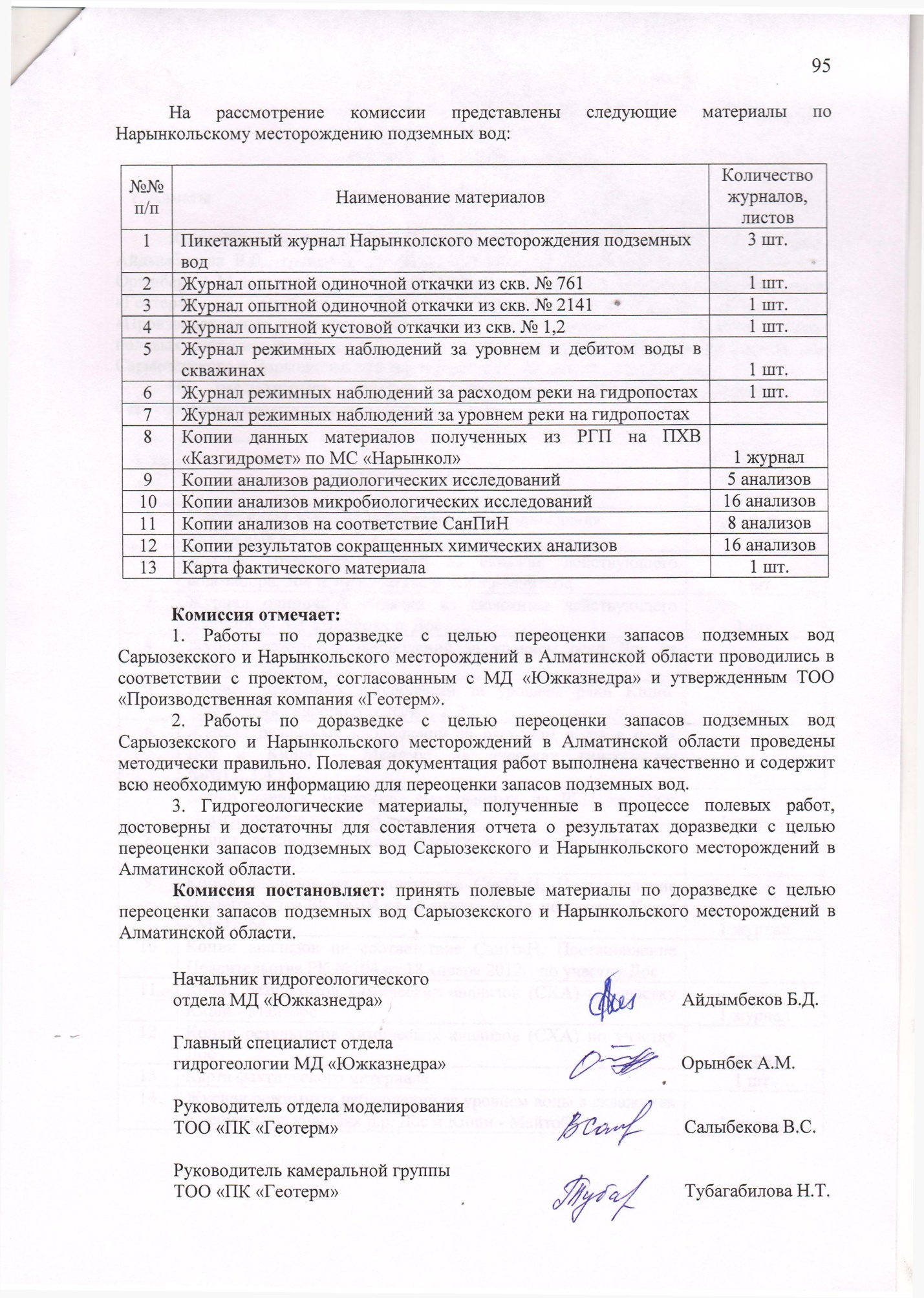Комиссия в составе: начальника гидрогеологического отдела МД «Южказнедра» - Айдымбекова Б.Д., главного специалиста отдела гидрогеологии МД «Южказнедра» - Орынбека А.М. и руководителя отдела моделирования ТОО «Производственная компания «Геотерм» - Салыбековой В.С., и руководителя камеральной группы ТОО «Производственная компания «Геотерм» - Тубагабиловой Н.Т. произвели приемку полевых материалов по доразведке с целью переоценки запасов подземных вод Сарыозекского и Нарынкольского месторождений в Алматинской области. На рассмотрение комиссии представлены следующие материалы по Сарыозекскому месторождению подземных вод: