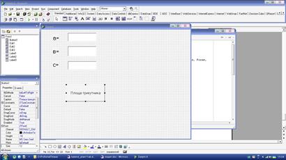 в. створіть обробник подій OnClick для кнопки Button1, що знаходить площу трикутника за трьома сторонами; відповідь вивести в окремому вікні; г. протестуйте проект, ввівши значення для сторін 13, 14 та 15 см; д. порівняйте результат виконання проекту та відповідь при матемачному обчисленні; е. збережіть виконуваний файл проекту в своїй папці під назвою „Практична робота №2”.