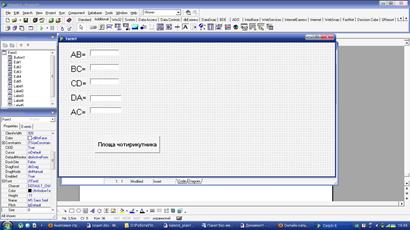 в. створіть обробник подій OnClick для кнопки Button1, що знаходить площу чотирикутника в окремому вікні; г. протестуйте проект, підставивши зачення AB=13см, ВС=14 см, CD=8см, DA=17см і АС=15см; д. порівняйте результат виконання проекту та відповідь при матемачному обчисленні площі; е. збережіть виконуваний файл проекту в своїй папці під назвою „Практична робота №4”.
