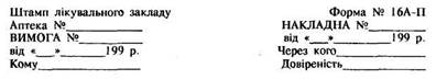 ВИПИСУВАННЯ ЛІКАРСЬКИХ ПРЕПАРАТІВ У ВІДДІЛЕННІ Лікарські речовини для відділення виписує старша медична сестра за дорученням, яке видає бухгалтерія лікувального закладу. Засвідчується доручення підписом головного лікаря, головного бухгалтера і круглою печаткою лікувального закладу. На отримання наркотичних (психотропних) речовин доручення видаються щоразу. На отримання спиртів і спиртових розчинів — 1 раз на місяць. На одержання готових, екстемпоральних лікарських препаратів перев'язного матеріалу та предметів догляду за хворими доручення оформляють 1 раз на квартал. Вимоги-замовлеиня на одержання ліків з аптеки заповнюють за групами: · до І групи лікарських засобів відносять наркотичні (психотропні) засоби; · до II групи лікарських препаратів відносять спирти та спиртові розчини; · до III групи лікарських засобів відносять ліки заводського виготовлення; · до IV групи лікарських засобів відносять екстемпоральні ліки, тобто ті, що виготовляють в аптеці; · до V групи відносять перев'язний матеріал та предмети догляду за хворими. Старша медична сестра (старша акушерка) є довіреною особою, яка виписує, оформляє та здає в аптеку вимогу-замовлення. Вона ж перевіряє правильність одержання ліків із аптеки. Лікар після щоденного огляду хворих у відділенні записує в історію хвороби необхідні кожному хворому лікарські препарати, їх дози, кількість прийомів та шляхи введення. Палатна медична сестра щоденно, роблячи вибірку призначень з медичної карти стаціонарного хворого, переписує їх у листок призначень окремо для кожного хворого. Відомості про призначені хворому ін'єкції вона передає у процедурний кабінет. Перелік усіх призначених лікарських препаратів, написаний українською мовою, палатні та процедурні сестри передають старшій медичній сестрі відділення. Вона сумує одержані дані і виписує вимогу (накладну-квитанцію) на одержання цих ліків з аптеки. Вимога складається з двох частин: відривної частини, яку направляють в аптеку, і корінця, який залишається у відділенні. Підписує вимогу завідуючий відділенням та старша медична сестра.