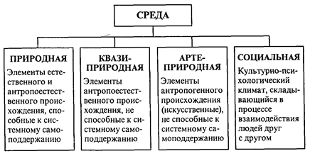 Микроорганизмы - это мельчайшие, преимущественно одноклеточные живые существа различной систематической принадлежности (представляющие как растительное, так и животное царства), видимые только в микроскоп. К ним относятся бактерии, микоплазмы, риккетсии, микроскопические грибы, водоросли, простейшие и вирусы. Микроорганизмы играют большую роль в круговороте веществ в природе. Некоторые из них активно используются человеком в пищевой и микробиологической промышленности: виноделии, хлебопечении, производстве лекарственных препаратов, витаминов и др. Значительную долю среди микроорганизмов составляют патогенные формы, вызывающие заболевания растений, животных и человека. Несколько иной подход к анализу структуры среды человека предложил Н. Ф. Реймерс. Он выделил в окружающей человека среде четыре неразрывно взаимосвязанных компонента-подсистемы: а) природную среду, б) среду, порожденную агротехникой - так называемую вторую природу, или квазиприроду, в) искусственную среду - «третью природу», или артеприроду, г) социальную среду (рис. 3).