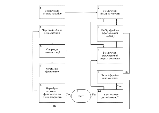 Навіть у такій ґрунтовно регламентованій документами сфері, як робота міністерства, для формулювання глобальної мети очолюваної ним галузі потрібно кілька разів уточнювати й узгоджувати її, перш ніж вона стане об'єктом аналізу. Це стосується не тільки формулювань мети, але й визначення будь-якого вислову, який потрібно аналізувати. Від правильності вибору об'єкта аналізу залежить, чи дійсно ми будемо робити те, що потрібно. Блок 2. Цей блок визначає, навіщо потрібно те, що ми будемо робити. Цільова система – та, в інтересах якої виконують аналіз. Знову зазначимо, що неможливо більш формально визначити цільову систему, тому що багато чого залежить від конкретних умов. Блок 3. Цей блок містить набір фреймових моделей і рекомендовані правила їх перебору чи звертання до експерта з проханням самому визначити черговий фрейм. Блок 4. Експерт будує змістовну модель, за якою буде зроблено декомпозицію, на основі вивчення цільової системи. Дуже корисними для цього можуть бути різні класифікатори в певних областях знань, а також інформація, зібрана в довідниках і спеціальних енциклопедіях. Блоки 5—10 було достатньо пояснено раніше. Блок 11. Остаточний результат аналізу оформлюють у вигляді дерева, кінцеві фрагменти гілок якого – або елементарні фрагменти, або ті, які експерт визнав складними, але які не можна далі розкладати. Причини такої складності можуть критись або в обмеженості знань експерта чи групи експертів (складність через нерозуміння), або в тім, що потрібні знання існують, але їх іще не об'єднано в пояснювальні моделі (складність через нерозуміння), або в принциповому браку потрібних знань (складність через незнання). Отже, один зі способів спрощення складного – метод декомпозиції – полягає в розкладенні складного цілого на все дрібниші (та простіші) частини. Компромісу між простотою та повнотою при цьому досягають за допомогою понять істотності, елементарності, поступової деталізації моделей та ітеративності.