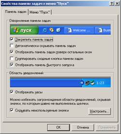 Рис. 17. Вікно налаштування властивостей панелі задач та кнопки «Пуск».