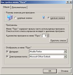 Вкладка «Панель завдань» дозволяє закріпити, автоматично приховувати, відображати поверх решти вікон панель завдань, відображати панель швидкого запуску та годинник, налаштовувати функцію приховування ярликів, що не використовуються. Закладка меню «Пуск» дозволяє змінювати вигляд кнопки «Пуск». Кнопка Налаштувати (рис. 18) дозволяє змінити розмір значків, змінювати кількість програм, виділяти недавно встановлене ПЗ та очищувати список ярликів програм, що нещодавно використовувалися (рис. 19).