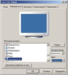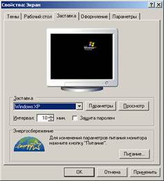 Закладка Тема відповідає за набір значків, кольорів, звуків та інших елементів інтерфейсу Windows, які надають цілісного і неповторного вигляду. Можна використовувати готові теми або створювати власні. Для зміни фону робочого столу використовують заставку Робочий стіл: вибрати зі списку фонових малюнків або з власної колекції – натиснувши кнопку Обзор (рис. 20) та вказавши місце розташування даного рисунку. Залежно від розміру зображення потрібно звернути увагу на варіанти розташування: замостити – розмістити зображення поруч, розтягнути – розмістити зображення на весь екран, по центру – розміщення зображення по центру екрану. Кнопка «Настройка робочого столу» відповідає за наявність на робочому столі значків «Мій комп’ютер», «Мої документи», «Мережеве оточення» та можливості зміни зображення їхнього значка. Закладка Заставка (рис. 21) відповідає за налаштування зміни зображення, яке буде виводитися на екран через певний час простою комп’ютера. Можна змінити тип заставки,налаштувати її параметри змінити час, через який вона буде вмикатися, захистити паролем. Після чого можна переглянути результат, натиснувши кнопку Перегляд.