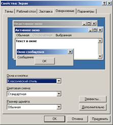 Закладка Оформлення (рис. 22) – містить перелік кольорових тем, що визначають загальний вигляд всіх елементів екрану (заголовків вікон, фону активного і неактивного вікна, розміру та кольору шрифту). Кожен з елементів може мати свій розмір, колір та фон. Можна використовувати як вже існуючі схеми, так і створювати свої. Для створення власної схеми потрібно скористатися кнопкою Додатково. Для використання різноманітних ефектів натискають кнопку «Ефекти». Для зміни розширення екрану використовують закладку Параметри.