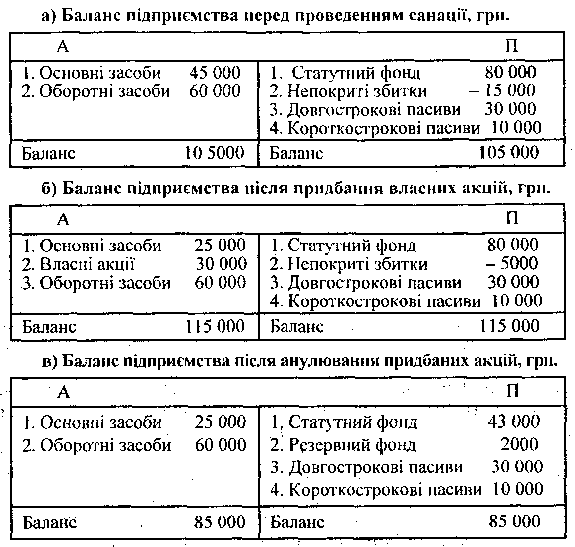 11.3.3. САНАЦІЯ БАЛАНСУ. ЗМЕНШЕННЯ СТАТУТНОГО ФОНДУ ПІДПРИЄМСТВА наверх Розглянемо тепер комплекс санаційних заходів, спрямованих на реструктуризацію пасивів підприємства. Ці заходи пов'язані зі зміною розмірів та структури фінансових джерел формування активів. Маючи збитки, підприємства, як правило, не заінтересовані показувати їх у своїй звітності, зокрема в балансі. Особливо це стосується акціонерних товариств, оскільки їхні баланси публікуються в пресі. За наявності балансових збитків суб'єктам господарювання дуже важко розраховувати на залучення фінансових ресурсів із зовнішніх джерел, оскільки як для кредиторів, так і для потенційних інвесторів збиткове підприємство є непривабливим об'єктом фінансування. Відтак збиткові підприємства можуть вдатися до санації балансу (чиста санація). Чиста санація передбачає покриття відображених в балансі збитків за рахунок власних та прирівняних до них коштів. Згідно із законодавством України, збитки підприємств можуть списуватися за рахунок резервних (страхових) фондів, засобів цільового призначення (спеціальні фонди і цільове фінансування) або за рахунок санаційного прибутку, який може утворитися за зменшення статутного фонду підприємства. Ліквідність та платоспроможність підприємства в результаті чистої санації не поліпшуються, оскільки підприємство не залучає додаткових фінансових ресурсів. Санація балансу за рахунок санаційного прибутку доцільна лише тоді, коли вичерпано інші можливості покриття балансових збитків. Даний (розрахунковий) прибуток утворюється в результаті зменшення статутного фонду підприємства. Санаційний прибуток - це прибуток, який виникає внаслідок викупу підприємством власних корпоративних прав (акцій, паїв) за курсом, нижчим від номінальної вартості цих прав, або в результаті їх безкоштовної передачі для анулювання, зниження номінальної вартості або за одержання безповоротної фінансової допомоги від власників корпоративних прав, кредиторів та інших заінтересованих у санації підприємства осіб. Перша складова санаційного прибутку дорівнює різниці між номінальною вартістю корпоративного права та ціною його викупу емітентом і витратами, пов'язаними з процедурою викупу прав та зменшення статутного фонду. Якщо корпоративні права надаються для анулювання безкоштовно, то санаційний прибуток дорівнюватиме номінальній вартості наданих для анулювання прав за мінусом витрат, пов'язаних зі зменшенням статутного капіталу. Порядок зменшення статутного фонду підприємств. Основні цілі та завдання зменшення статутного фонду підприємств: * одержання санаційного прибутку, який спрямовується на покриття балансових збитків; * урівноваження (або перевищення) номінальної вартості акцій (паїв) з їхньою ринковою ціною, оскільки в період фінансової кризи може скластися ситуація, коли біржова ціна буде суттєво меншою за номінальну вартість акцій. Залучення засобів через додаткову емісію корпоративних прав у даному разі неможливе; * приведення у відповідність величини основних та оборотних засобів підприємства з розміром його власного капіталу, оскільки з метою підвищення платоспроможності підприємство може прийняти рішення про продаж частини свого майна, що й спричинятиметься до такої невідповідності; * концентрування статутного капіталу в р