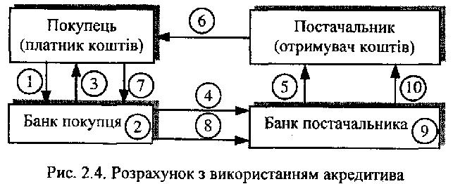 1 - покупець доручає банку, що його обслуговує, відкрити акредитив; 2 - банк покупця відкриває акредитив; 3 - банк покупця сповіщає покупця про відкриття акредитива; 4 - банк покупця повідомляє банк постачальника про відкриття акредитива постачальнику на конкретну суму; 5 - банк постачальника сповіщає постачальника про відкриття акредитива; 6 - відвантаження товару; 7 - покупець повідомляє банк про виконання умови акредитива, тобто дає наказ на розкриття акредитива; 8 - банк покупця переказує банку постачальника суму коштів з акредитива; 9 - банк постачальника зараховує кошти на рахунок постачальника; 10 - банк постачальника повідомляє про це свого клієнта. Акредитивна форма розрахунку дає постачальнику впевненість, що відвантажений товар буде своєчасно оплачено. Для постачальників (отримувачів коштів) акредитивна форма розрахунків надійна, відносно проста і приваблива, оскільки гарантує оплату. Покупцям розрахунки з використанням акредитива не вигідні, бо на певний час кошти вилучаються з обороту, що погіршує фінансове становище підприємств-покупців.