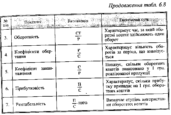 Вк - власні кошти; З - забезпечення наступних витрат; Оз - основні засоби та інші позаоборотні активи; Пк - позикові кошти; Фн - фактична наявність оборотних коштів; Н - норматив оборотних коштів; М - вартість майна підприємства; С - середня вартість оборотних коштів; Т - тривалість періоду, за який обчислюється обертання оборотних коштів; Р - обсяг реалізації продукції; П - прибуток від реалізації продукції. Показники стану й ефективності використання оборотних коштів, порядок їхнього визначення та їхній економічний зміст наведено в табл. 6.8.