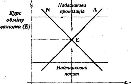 Валютний ринок — система економічних відносин, пов'язаних з операціями купівлі-продажу іноземної валюти та інших валютних цінностей. Він представляє розгалужену систему механізмів, функціонування яких покликане забезпечити операції з валютою для обслуговування міжнародних платежів. Іншими словами, валютний ринок практично охоплює конверсійні та депозитно-кредитні операції, що здійснюються між контрагентами в іноземній валюті за ринковим курсом або процентною ставкою. Функціональне призначення валютного ринку — це урівноваження попиту і пропозиції такого специфічного товару, як іноземної валюти. Тільки через взаємодію попиту та пропозиції на ринку визначаються валютні курси аналогічно, як і ціни будь-якого матеріального блага або активу. Пропозиція і попит на іноземну валюту зосереджується переважно в комерційних банках, які мають найбільш розгалужену мережу кореспондентських відносин з банками інших країн. Основними формами участі банків у валютних операціях є обслуговування потреб клієнтів щодо купівлі-продажу іноземної валюти, здійснення міжнародних розрахунків та фінансування міжнародних угод. Модель валютного ринку можна зобразити графічно, розглядаючи пропозицію і попит на валюту як функцію ціни. Ціною на валютному ринку є валютний курс. На рис.у точці перетину кривих ліній попиту і пропозиції формується рівноважний валютний курс — (Е), коли пропозиція валюти й попит на неї збігаються. Рівновага на валютному ринку