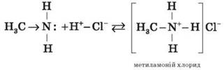 Зв’язок протона з аміном, як і з амоніаком, утворюється за донорно-акцепторним механізмом за рахунок неподіленої електронної пари атома Нітрогену. Аліфатичні аміни — сильніші основи, ніж амоніак, оскільки алкільні радикали збільшують електронну густину на атомі Нітрогену. З цієї причини електронна пара атома Нітрогену утримується менш міцно й легше взаємодіє з протоном. Взаємодія з кислотами Взаємодіючи з кислотами, аміни утворюють солі: