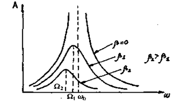 Явище досягнення максимальної амплітуди вимушених коливань при заданих ωо і β називають резонансом. Явище резонансу спостерігається при такій частоті Ωрез вимушуючої сили, при якій амплітуда вимушених коливань А досягає максимального значення. Відповідно до формули (1.55) дослідження функції A =f(Ω) на екстремум дає рівняння Цьому значенню резонансної частоти відповідає значення резонансної максимальної амплітуди За відсутності затухання (β = 0): Ωрез = ω0, а Арез → На мал. 1.25б подані резонансні криві - залежності амплітуди вимушених коливань від частоти змушуючої сили при різних коефіцієнтах затухання (β1< β2).