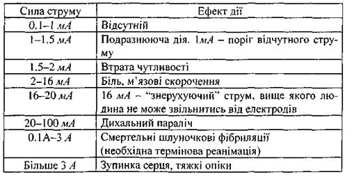 Первинна дія постійного струму на організм пов'язана в основному з двома процесами: поляризацією - виникненням дипольного моменту в тканинах та рухом заряджених частинок - їх появою і зміною концентрації, які призводять до порушення нормального для клітини розподілу зарядів і, як наслідок, її функцій. Небезпеку для організму становить не саме електричне поле (напруга чи напруженість), а електричний струм, що протікає, особливо постійний. Найкращою провідністю характеризуються нервові волокна; тому навіть слабкий струм є своєрідним ударом для нервової системи. Із зменшенням опору R (при збільшенні вологості, наприклад) сила струму / навіть за малих напруг може різко зростати. Особливо небезпечно, коли струм проходить через життєво важливі органи - серце, мозок. Із збільшенням частоти струму його шкідлива дія зменшується. Деякі ефекти, що мають місце при дії електричного струму побутової частоти (50 Гц) на людський організм, містяться в табл. 2.6. Приведені порогові значення сили струму певною мірою умовні, їх величини залежать від місця й площі контакту, вологості та інших чинників. Таблиця 2.6.