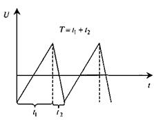 Мал. 2.47. Мал. 2.48. Крім вказаних електродів, у трубці знаходяться вертикально (Y) і горизонтально (X) відхиляючі пластини, а також електрод Блок синхронізації. Частота генератора не зовсім стабільна з ряду причин - флуктуації напруги й опору залежно від змін навколишніх умов та інших причин. Джерела досліджуваних сигналів також не стабільні. Це приводить до нестійкості осцилограми. Для усунення цього недоліку генератор горизонтальної розгортки узгоджують з досліджуваним сигналом, примушуючи їх працювати синхронно. Цю функцію в електронному осцилографі виконує блок синхронізації. Блок живлення. Забезпечує необхідну постійну напругу на електродах електронно-променевої трубки. До катода трубки прикладається негативна напруга більше 1000 В, а до анода - позитивна напруга до 5 кВ. Блок забезпечує також живлення нитки розжарення електронно-променевої трубки. Генератор розгортки. Для виявлення на екрані електронно-променевої трубки осцилограм необхідно на горизонтальний вхід осцилографа подати пилкоподібну регульовану за амплітудою і частотою напругу. На мал. 2.49 показана така напруга: Для спостереження синусоїдальних коливань (напруг) служить неперервна розгортка. Якщо спостерігаються процеси, які повторюються через неоднакові проміжки часу чи мають вигляд аперіодичних або одноразових імпульсів, то тривалість розгортки повинна бути трохи більшою, ніж тривалість досліджуваного сигналу. Такі розгортки називаються очікуючими чи одноразовими. Генератори такої розгортки приводяться в дію за допомогою зовнішнього пускового сигналу, під дією якого генератор очікуючої розгортки створює тільки один пилкоподібний імпульс. Часто генератор очікуючої розгортай сам виробляє сигнал, тоді відпадає необхідність синхронізації. Генератор міток часу. Сучасні осцилографи високого класу мають генератор міток часу або калібратор тривалості. Короткі імпульси цього генератора певної частоти підсилюються і подаються на модулятор. Позитивний потенціал модулятора утворює на осцилограмі ряд яскравих точок, негативний - утворює ряд менш яскравих, ніж осцилограми, точок. Точність визначення тривалості процесів зростає зі збільшенням кількості відміток часу на осцилограмі. Генератор калібрувального сигналу. Щоб вимірювати напругу, необхідно порівняти досліджуваний сигнал із сигналом каліброваної напруги - тобто такої, що має точно визначену величину. Для її отримання в осцилографі існує спеціальний генератор, який працює від стабілізатора напруги. За допомогою калібрувального сигналу визначають ціну поділки Отримання осцилограм. На екрані електронно-променевої трубки буде видно вертикальну світну лінію, якщо на вертикально відхилюючі пластини (X) подати змінну напругу. Якщо змінну напругу подати на горизонтально відхилюючі пластини (У), то на екрані трубки буде горизонтальна лінія. Якщо ж змінну напругу одночасно подати на вертикально та горизонтально відхилюючі пластини, то на екрані буде осцилограма, вигляд якої залежатиме від співвідношення частот, амплітуд і фаз сигналів, які подані на пластини X та Y. Для того щоб отримати стійку осцилограму на екрані електронно-променевої трубки, необхідно на У-пластини подавати досліджувану напругу, а на X - пилкоподібну напругу. Частоти цих напруг повинні бути або рівними або кратними одна о
