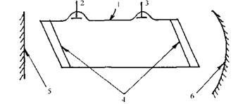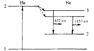 Рис. 7.17.Будова газового гелій-неонового лазера. На рис. 7.18 зображена система енергетичних рівнів атомів гелію та неона. Під дією електричного розряду атоми гелію переходять на збуджений рівень 2. Внаслідок непруж-ного зіткнення атоми гелія передають енергію атомам неона, які, збуджуючись, накопичуються на двох близько розташованих метастабільних рівнях 3. Таким чином, у трубці створюється середовище з інверсною заселеністю енергетичних рівнів.