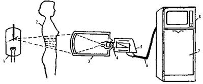 Рис. 8.18.Схема рентгенотелевізійної установки. Основними компонентами рентгенотелевізійної установки є: 1 - джерело рентгенівського випромінювання; 2 -об'єкт; 3 - ЕОП; 4 - проектуюча оптика; 5 - передавальна телекамера; 6 - кабель; 7 - приймальний пристрій; 8 -екран. Застосування рентгенотелебачення зменшує дозу опромінення пацієнта в 15 разів порівняно з тією, яку дістають при проведенні звичайного просвічування, і в 3-5 разів менше порівняно з дозою, отриманою при просвічуванні за допомогою ЕОП. Час обстеження скорочується приблизно на чверть порівняно з часом звичайного дослідження завдяки достатньо високій яскравості та контрастності зображення. Якщо до того ж врахувати, що при рентгенотелевізій-ному дослідженні зменшується кількість рентгенівських знімків, то сумарна доза опромінення при такому дослідженні зменшується в 25-30 разів порівняно із звичайною рентгеноскопією. Рентгенотелевізійне зображення можна сфотографувати, зняти на кіноплівку, записати на відеокасету.