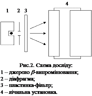 І х = І 0 е (- μρ d ), (1) де І 0 – інтенсивність падаючого потоку; І х – інтенсивність потоку після проходження шару поглинача товщиною d; μ – масовий коефіцієнт поглинання; ρ – густина речовини. Величину ρd (кг/м2) називають масовою товщиною поглинаючого шару. При деякій товщині d max спостерігається повне поглинання β -частинок потоку. Значення d max ρ = R вважається ефективним пробігом частинок. Ця величина практично не залежить від роду поглинача і зручна для визначення граничної енергії Е max β -спектру. Зв’язок між величинами R i E max заданий формулами: R = 0,54 E max – 0,13 для 0,8 < E < 3 МеВ; (2) R = 0,41 E max – 1,4 для 0,15 < E < 0,8 МеВ. (3) У виразах (2) і (3) R вимірюється в г/см2, а Е – в МеВ. Для експериментального визначення R між джерелом випромінювання і лічильною установкою розміщують алюмінієві пластинки різної товщини і при досягненні d = d max інтенсивність β -потоку стає рівною нулю і лічильник фіксує лише фон. Побудувавши криву залежності