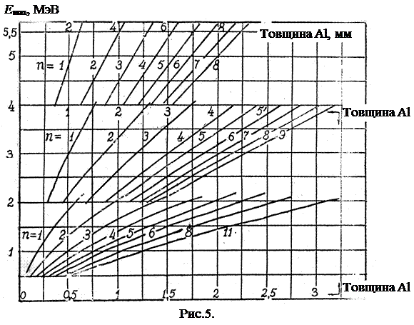 На номограмі числа біля кривих відповідають значенням n, а вздовж вісі ординат – граничній енергії E max. Для визначення E max цим методом необхідно знайти за допомогою кривої поглинання (рис.3) величини товщини шарів, при яких інтенсивність спадає в 2, 4, 8,... n разів і за графіком на рис.5 знайти значення E max.