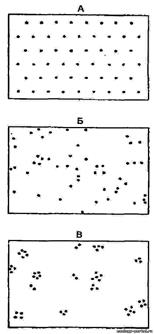 . Основні типи розподілу особин в популяції: Рівномірний розподіл у природі частіше пов'язане з гострою конкуренцією між різними особинами. Такий тип розподілу відзначають у хижих риб і у колюшек з їх територіальним інстинктом і суто індивідуальним характером. Так, в сосновому лісі дерева спочатку розселяються групами, а надалі їх розміщення стає рівномірним. Популяції групове розподіл забезпечує (по Ю. Одуму, 1986) більш високу стійкість по відношенню до несприятливих умов порівняно з окремою особиною. Тварини, провідні рухливий спосіб життя, як правило, розподіляються активно, що призводить до інтенсивного перемішування популяцій і стирання кордонів між ними. Наприклад, дуже рухливі й активно переміщаються песці, інші тварини, птахи мають величезні ареали без різких кордонів між популяціями.