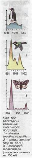 Це поняття ввів російський біолог С.С. Четвериков. Популяційні хвилі можуть бути сезонними чи несезонними. Сезонні популяційні хвилі зумовлені особливостями життєвих циклів організмів або сезонними змінами кліматичних факторів. Наприклад, за умов чітко виражених сезонних змін довкілля, розмноження організмів, як правило, припадає на сприятливі періоди року, а в несприятливі, навпаки, спостерігають підвищену смертність, особливо видів із нетривалим терміном життя. Приміром, комахи розмножуються переважно наприкінці весни-влітку, а наприкінці осені та взимку значна частина особин їхніх популяцій гине. Несезонні популяційні хвилі можуть бути спричинені зміною інтенсивності дії різних екологічних факторів (наприклад, спрямовані протягом тривалого історичного періоду зміни кліматичних факторів, інтенсивний вплив хижаків або паразитів, господарська діяльність людини). Як регулюється чисельність популяцій? Ви знаєте, що чисельність популяції залежить від рівня народжуваності й смертності особин, які входять до її складу. Якщо інтенсивність народжуваності перевищуватиме смертність, то приріст популяції буде позитивним, якщо ж навпаки - негативним. Тривалий негативний приріст популяції з часом може спричинити її зникнення. Рівень народжуваності та смертності особин популяції залежить від багатьох чинників, насамперед від ресурсів, потрібних для її нормального існування (наявність їжі, води, місць гніздування). За низької густоти популяції, коли є надлишкові ресурси, необхідні для її існування, народжуваність перевищуватиме смертність, а за надто високої — навпаки. Надмірне зростання густоти популяції спричинює виснаження ресурсів середовища існування і тому є негативним явищем. Зниження густоти популяції є сигналом для запровадження заходів щодо її охорони. Теоретично для кожного комплексу умов середовища є певна оптимальна густота популяції того чи іншого виду, за якої народжуваність і смертність врівноважуватимуть одна одну. В цьому випадку не відбувається ні зростання, ні зменшення чисельності популяції. Такий врівноважений стан популяції відповідає поняттю ємності середовища існування - його здатність забезпечити нормальну життєдіяльність певній кількості особин популяції без помітних порушень у довкіллі. При цьому рівень споживання ресурсів має врівноважуватись їхнім відновленням. Як тільки густота популяції стає вищою чи нижчою певного рівня, в ній спрацьовують процеси саморегуляції, що приводять цей показник у відповідність до ємності середовища існування. Зміни чисельності популяції проявляються у вигляді популяційних хвиль. Густота популяції залежить і від змін інтенсивності дії кліматичних факторів. Популяції рослин і тварин, що мають тривалий період розвитку, як правило, характеризуються відносно повільними темпами розмноження і порівняно слабкою чутливістю до змін кліматичних факторів. Зміни чисельності популяцій таких видів значно розтягнені в часі: періоди зростання чисельності та її зниження спостерігаються раз у декілька років. Так, дослідження змін чисельності популяцій рисі показали, що її максимум спостерігається приблизно раз на 10 років і пов'язаний зі зростанням чисельності популяцій зайця, який слугує рисі кормовою базою (мал. 131).