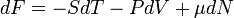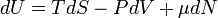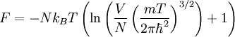 де Внутрішня енергія, як термодинамічний потенціал Оскільки внутрішня енергія є функцією стану, то її можна визначити як термодинамічний потенціал, залежний від об'єму, числа частинок у системі, та ентропії: U(V,S,N). Для квазістатичних процесів виконується співвідношення: де T — температура, S — ентропія, P — тиск, μ — хімічний потенціал, N — кількість частинок в системі. Ві́льна ене́ргія Гельмго́льца — термодинамічний потенціал, який визначає рівноважні термодинамічні характеристики системи в залежності від об'єму й температури. Рівновжний стан системи багатьох часток при визначеному об'ємі й сталій температурі визначається мінімумом вільної енергії. Дослідження показали, що нагрітий газ при охолодженні, що не роби, не віддає всю свою енергію. Ту частку енергії газу, яку можна було відібрати й перетворити в корисну роботу, стали називати вільною енергією. Вільна енергія F визначається, як Зміна вільної енергії дорівнює роботі, виконаній над тілом при ізотермічному процесі Диференціал вільної енергії дорівнює У випадку системи із змінним числом часток, диференціал вільної енергії отримує додатковий член де μ — хімічний потенціал, N — число часток. Вирази для вільної енергії деяких термодинамічних систем Для класичного ідеального одноатомного газу вільна енергія дорівнює