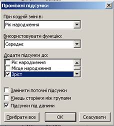 Послідовність дій при виконанні завдання: 1. Перш ніж вставляти проміжні підсумки, слід відсортувати список, щоб згрупувати рядки, за якими потрібно підбити підсумки. На аркуші Проміжні підсумки відсортуйте за зростанням дані в колонці Рік народження. 2. Виділіть усю таблицю вхідних даних. 3. Виконайте команду Дані ► Підсумки…(Ітоги…) 4-5. Спочатку встановіть режим знаходження середнього зросту, а потім - максимальної маси, знявши при цьому позначку прапорця Замінити поточні підсумки.