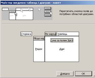 1. Виконайте команду Дані ► Зведена таблиця. Буде відкрито перше вікно майстра зведених таблиць. Нічого в ньому не змінюючи, клацніть кнопку Далі (Крок 1 із 3). 2. (Крок 2 із 3). У другому вікні майстра зведених таблиць виберіть діапазон вихідних даних (таблицю), клацніть кнопку Далі. 3. (Крок 3 із 3). Включити перемикач Розташувати таблицю на новому аркуші. Клацнути кнопку Макет і визначте структуру таблиці: · Місце народження перетягнути у поле Рядок; · Рік народження перетягнути у поле Стовпик; · Зріст перетягнути у поле Дані; · Виконати подвійне клацання лівою клавішею миші по кнопці Сума по полю зріст, яка з’явилась після виконання попереднього пункту, та у вікні Обчислення поля зведеної таблиці вибрати операцію Середнє, ОК, ОК, Готово. · Закрити список полів зведеної таблиці. Завдання 18. На новому аркуші побудуйте діаграму по зведеній таблиці. Послідовність дій при виконанні завдання: 1. На аркуші зі зведеною таблицею натиснути кнопку 2. Діаграма побудується на новому аркуші.