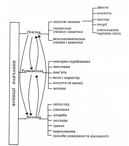 Рис. 15. Структура функцій навчального процесу нижчому рівні пізнавальної діяльності (в школі та поза нею). Потрібний рівень зумовлений програмними вимогами з конкретної навчальної дисципліни. Логіка навчального процесу містить такі компоненти (рис. 16): 1) розуміння та усвідомлення пізнавальних завдань; 2) оволодіння знаннями; 3) виведення законів і правил; 4) формування умінь і навичок; 5) застосування знань; 6) аналіз і оцінювання навчальної діяльності.