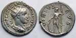 Double denarius, Rome mint, Rome mint, end of July 238 – end of July 239, First issue, AR 4,10g. IMP CAES M ANT GORDIANVS AVG Radiate bust right. Rev. VIRTVS AVG Virtus in military dress, standing left, holding reversed spear & resting right hand on shield. RIC 6 (IV, III, 16); RSC 381 (IV, 10). Extremely Fine / Extremely Fine.