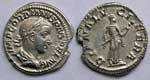 Denarius, Rome mint, special issue for marriage of Gordian and Tranquillina, Summer AD 241, AR 3,19g. IMP GORDIANVS PIVS FEL AVG Laureate bust right. Rev. PIETAS AVGVSTI Pietas, veiled, standing facing, head left, raising both hands. RIC 129 (IV, III, 28); RSC 186 (IV, 5). Extremely Fine / Extremely Fine.
