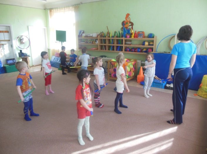Перестроение в колонну по одному: 1. Ходьба обычная, ходьба на носках – «будьте осторожны, в любой момент может появиться змея»; 2. Бег с высоким подниманием колен (палочки перед собой) – «сели на наших верных помощников коней, впереди кочки»; 3. Ходьба приставным шагом правым боком – «лианы свисают, мешают нам идти, обойдем их с правой стороны»; 4. Ходьба приставным шагом левым боком – «лианы свисают, мешают идти, обойдем их с левой стороны»; 5. Бег с захлестыванием голени назад со сменой направления движения – «по-моему мы вышли не на ту тропу, повернем обратно» - 2 раза; 6. Прыжки с продвижением вперед – «на пути небольшие кочки»; 7. Ходьба в полуприседе; 8. Корректирующая ходьба на внешней стороне ступни – «идем по следу».