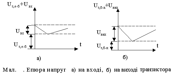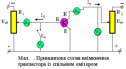 Вхідна напруга Uсиг подається на дільницю база-емітер, до якої прикладена напруга зміщення Uеб. При цьому через базу тече деякий струм Іб. Коло колектора (вихідне) живитьс Статичні характеристики транзистора знімаються на сталому струмі. До них відносяться залежність струму Іб від напруги Uеб при сталій напрузі Uеk - вхідні характеристики та залежність Ік від напруги Uеk при сталому струмі Іб - вихідні характеристики. В роботі розглядаються сімейства цих