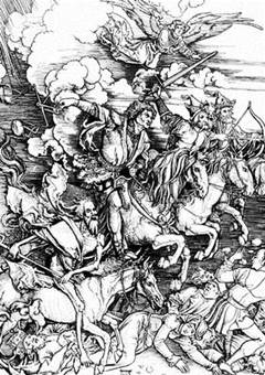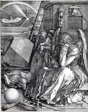 1498р. У гравюрі "Чотири вершники Апокаліпсиса" коні летять над тілами упалих людей. Емоційна напруженість досягається за допомогою протиставлення темного густого паралельного штрихування, більших плям чистого білого паперу й місць, де форми ледь позначені тонкими лініями; так створюється дивний скульптурний ефект. 30. А. Дюрер *Меланхолія*