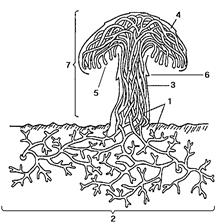 1-гіфи, 2-міцелій, 3-ніжка, 4-шапинка, 5-гіменофор, 6-часткове покривало