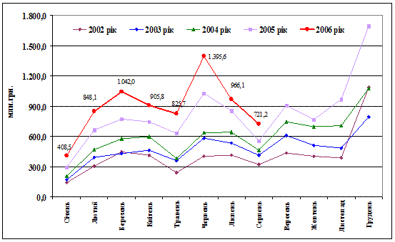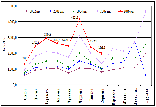 Як бачимо з Рисунка 1 і Таблиці 1, кожного року в бюджеті передбачено більше коштів, ніж у попередньому. Адже розвиток ефективне фінансування освіти, а отже і її розвиток зумовлений необхідністю реалізації сучасної політики і стратегії держави, спрямованих на подальшу розбудову національної системи освіти, адаптацію її до соціально орієнтованої економіки, інтеграцію у європейське і світове співтовариство. На Рисунку 2 і Рисунку 2.1 подано графік щомісячних видатків 2002 – 2006 р.