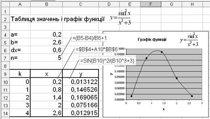 Калорійність 1 порції (Kalor1)? а) Калорійність хліба – 255, масла, ковбаси – 782. б) Калорійність хліба – 255, масла - 785, ковбаси – 780. Розділ 2. Розв'язування інженерних задач Тема 1. Побудова таблиці значень і графіка функції, що задана прямокутними, полярними координатами і параметрично Методичні вказівки Табулювання функції і побудова графіка функції є важливим елементом розв'язання багатьох інженерних задач. ТП Excel дозволяє легко і зручно це робити, причому кількома способами. Важливим є те, що початкові дані можна записати окремо від таблиці, а в таблиці будуть посилання на них. Це дозволяє при зміні початкових даних отримувати автоматичний перерахунок таблиці значень функції і, відповідно, графіка функції. Такий спосіб табулювання функції дає змогу використовувати його як початковий етап для розв'язання інших інженерних задач, зокрема, для знаходження коренів нелінійних рівнянь та ін. Приклад. Протабулювати функцію Для побудови графіка функції слід на першому кроці вибрати тип Точечная, на другому кроці – в закладці Ряд задати значення х і у. У завданні 1 b) задані початкове значення аргумента а, крок зміни аргумента dx і кількість кроків n. Кінцеве значення аргумента можна обчислити за формулою
