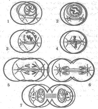 Рис. 5. Схема мітозу: 1,2 — профаза; З, 4 — метафаза; 5 — анафаза; 6,7 — телофаза