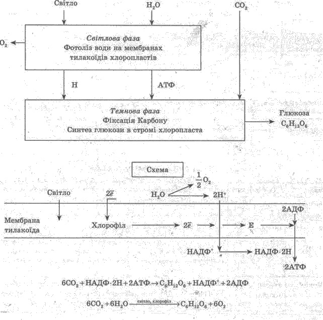 Основним фотосинтетичним пігментом вищих рослин є хлорофіл. За хімічною структурою розрізняють хлорофіл а (міститься у хлоропластах всіх зелених рослин та ціанобактерій), в, с та д (в клітинах водоростей). Фотосинтез — це складний, багатоступінчастий процес, який складається з двох фаз: світлової і темнової. Світлова фаза фотосинтезу відбувається на мембранах тилакоїдів хлоропластів. Ця стадія розпочинається з моменту поглинання квантів світла молекулою хлорофілу; при цьому електрони атома Магнію у молекулі хлорофілу переходять на більш високий енергетичний рівень, нагромаджуючи потенціальну енергію; частина електронів зразу ж повертається на своє попереднє місце, а енергія, що виділяється при цьому, випромінюється у вигляді тепла; значна частина електронів з високим рівнем енергії передає її іншим хімічним сполукам для фотохімічної роботи, яка здійснюється за кількома основними напрямками. 1. Відбувається процес розкладу (фотоліз) води; при цьому утворюються електрони (