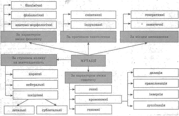 За характером змін генотипу мутації поділяються на такі види. 1) Генні (точкові) мутації— зміни нуклеотидної послідовності ДНК в межах одного гена внаслідок помилки репликації призводять до змін в амінокислотній послідовності кодованого геном білка і розвитку аномальної ознаки. Результатом генної мутації в людини є такі захворювання, як серпоподібноклітинна анемія, фенілкетонурія, дальтонізм, гемофілія. 2) Хромосомні мутації, або хромосомні перебудови, — зміни в структурі хромосом. Основні типи хромосомних мутацій: — делеція — втрата ділянки хромосоми; — транслокація — перенесення частини хромосом на іншу негомологічну хромосому (екстрахромосомні транслокації), як результат — зміна групи зчеплення генів; перенесення у межах однієї хромосоми (інтрахромосомні); — інверсія — поворот ділянки хромосоми на 180°; — дуплікація — подвоєння набору генів у певній ділянці хромосоми. Хромосомні мутації призводять до зміни генів і мають значення для еволюції виду. 3) Геномні мутації — зміни кількості хромосом у клітині, поява зайвої або втрата хромосоми в результаті порушень розходження хромосом до полюсів клітини під час мейозу та мітозу. Кратне збільшення кількості хромосом називається поліплоїдією (3n, 4n тощо). Цей вид мутації часто трапляється в рослин. Багато культурних рослин є поліплоїдними відносно диких предків. Анеуплоїдія — збільшення кількості хромосом на одну-дві. У тварин призводить до аномалій розвитку або загибелі організму. У людини трисомія по 21-й парі хромосом (2n+1) спричиняє синдром Дауна. Мутації можуть спричинятися дією мутагенних чинників: радіації, рентгенівських, ультрафіолетових променів, хімічних речовин, теплових впливів. Закон гомологічних рядів спадкової мінливості М. І. Вавилова. Радянський учений-біолог М. І. Вавилов установив закономірність виникнення мутацій у близькоспоріднених видів: «Генетично близькі роди і види характеризуються подібними рядами спадкової мінливості з такою правильністю, що, знаючи ряд форм у межах одного виду, можна передбачати наявність таких самих форм в інших видів і родів». Закон дає можливість передбачити характер мінливості у близькоспоріднених видів, що має значення в селекції.