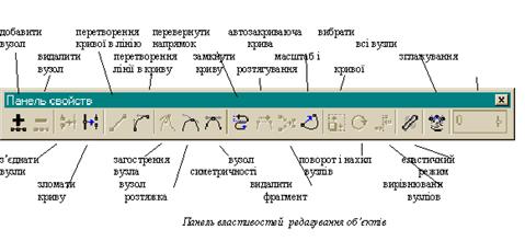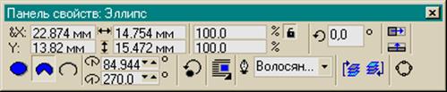 Панель властивостей еліпса Точні перетворення еліпса можні провести з допомогою панелі властивостей. На панелі можна змінити координати центру еліпса, вертикальний і горизонтальний розміри або пропорційно його величину, повернути його на заданный кут, виконати дзеркальне відображення, вирізати з еліпса сектор або дугу заданого кутового розміру, повернути сектор або дугу на 180°, змінити товщину лінії. Зміна форми об’єкту Для зміни форми об’єктів (ліній, еліпсів, і інш.) використовується інструмент Форма. Перетворення в криву виконується кліком на кнопці панелі властивостей Претворити в кривую. Після цього перетворення по кліку на інструменті Форма відкривається панель властивостей редагування..