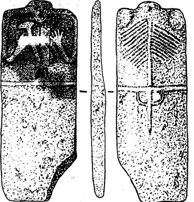 Спільні ознаки із Керносівським ідолом має антропоморфна стела зі с.Федорівка на Полтавщині. За значущістю вона посідає після Керносівського ідола друге місце. Стела дуже пошкоджена, позбавлена голови і плечевого пояса. Якщо Керносівський ідол композиційне розділений поясом на дві половини, то стела із Федорівки має два пояси. Як і Керносівський ідол, стела майже вся заповнена символічними зображеннями, які, ймовірно, повинні розкривати ідейну сутність божества. Руки постаті молитовне складені. Долоня лівої перекриває долоню правої, яка тримає предмет, що нагадує повернутий вістрям спис. Нижче рук проходять паралельно до них укладені дві рельєфні лінії — вони можуть бути^ витлумачені як стилізовано зображена грань грудної клітки. Серед символічних мотивів на стелі з Федорівки найбільше привертає увагу сюжет із зображенням хвостатого Оранта на її передній стороні. Зображений вище Оранта кінь — це традиційний солярний символ (тобто молитовний персонаж звертається із проханням до солярного божества). У фігурі Оранта підкреслено зображення фалоса, пов'язане із культом родючості: людина молиться до бога Сонця за збільшення кількості своїх тваринницьких стад — основного багатства тодішніх етносів, які кочували на наших землях. На зворотній стороні стели, крім традиційного "дерева життя", зображено контуром стопи людини. Такі стопи є у багатьох стелах Північного Причорномор'я. Вони зображені у величину натуральних стоп людини — вниз або догори пальцями. Цікаво, що стопи зображені тільки на антропоморфних стелах з теренів Північного Причорномор'я. На стелах з інших теренів Європи, тобто Румунії, Болгарії, Франції, північних регіонів Піренеїв вони відсутні. Подібні зображення стоп зустрічаємо серед рельєфів Кам'яної Могили. З інших регіонів світу подібні символи трапляються на петрогліфах Південної Швеції, храмах Індії. Є такі зображення статичних стоп і серед петрогліфів Біломор'я. Дослідники Я.Доманський та А.Столяр звертають увагу на існуюче колись повір'я, начебто кожна із видів тварин пізніше прийняла образ 56. І — Стела із с. Федорівна на Полтавщині. Вапняк. III тис. до н.е. 1 — лицева сторона; 2—4 — ліва і права бокові; 3 — зворотна сторона; II — Стела із с. Федорівка. Прорисовка. людини, тобто вона має серед людей свого старшого брата, котрий називається "хазяїном". Отже, такі зображення можна вважати слідами цього людиноподібного божества — господаря тварин. Освячення слідів людини має давню історію і ритуальну традицію серед багатьох релігій світу і відображено у багатьох культурах, міфологіях і літературних класичних пам'ятках. До речі, на ранніх стадіях формування релігійних уявлень поняття безтілесного божества, божества як ідеї не існувало. Кожне божество володіло матеріальною оболонкою, мало своє певне місце і подібно до людини залишало сліди від кроків. Таке розуміння сутності божества давало підстави підносити його реальні сліди до рівня сакральних символів, що і знайшло вираження у знаковості наших антропоморфних стел. Антропоморфні стели — початковий етап розвитку монументально-меморіальної скульптури на українських землях. Він пов'язаний із побутуючими сакрально-ідеологічними релігійними уявленнями індоєвропейських народів, частина яких з часом мігрувала в райони Іраку, а частина осіла на наших зе